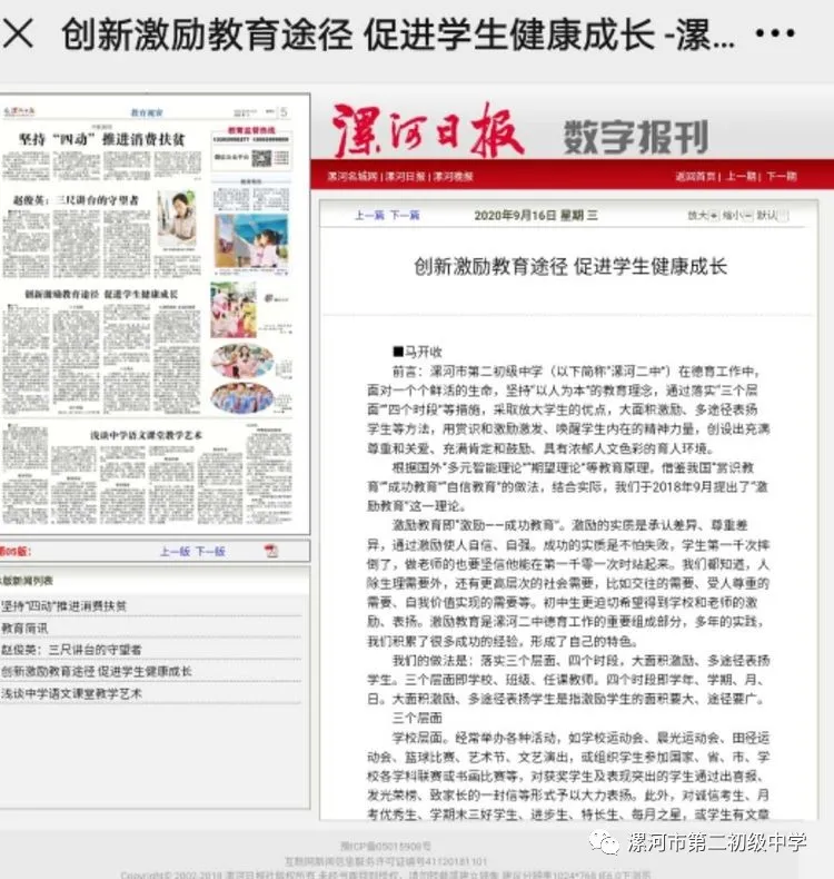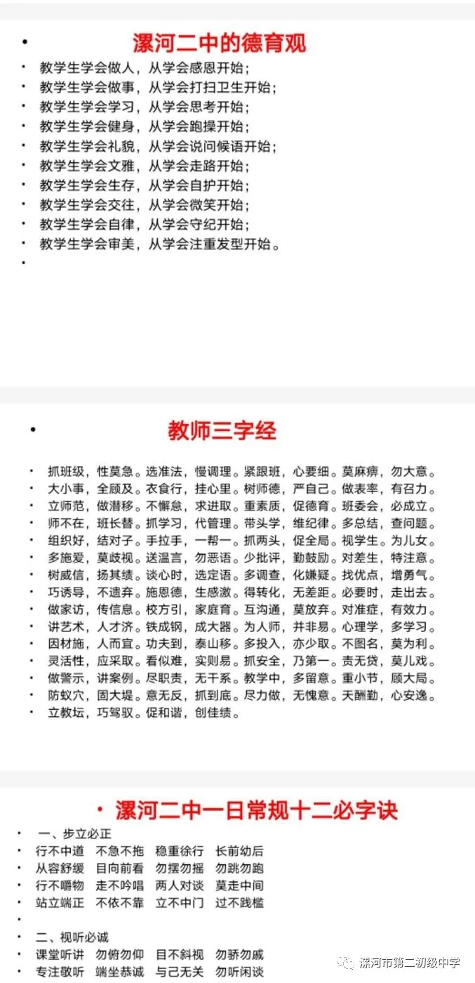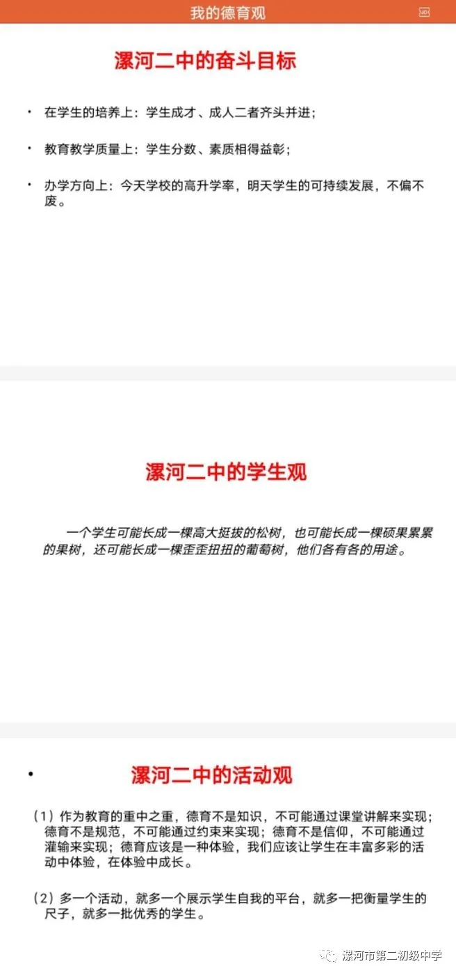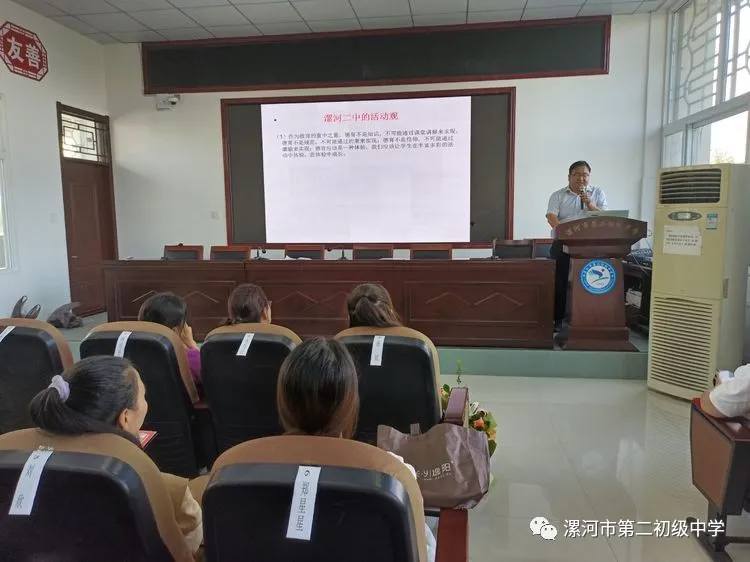 马校长的报告从漯河二中的奋斗目标、学生观、活动观、德育观、教师三字经、漯河二中一日常规十二必字诀等六方面分享了德育工作成功的经验,就新学期学校德育工作给予了指导:首先,要确立新学期学生德育工作目标,加强学生养成教育。其次要建立得力的班集体核心,组织丰富多样的社团和综合实践活动,培养正确的舆论和良好的班风学风;他在讲话中还对班主任工作提出期望,并就优秀班主任的基本素养提出了要求。班主任应该深入了解学生的思想动态和学习、生活上的需求和困难,紧密围绕学生的成长成才有效开展工作,班主任工作要注重创新工作思维,讲究说话艺术,改善人际关系,提高工作技巧,适应新时期学生特点的变化,特别是学生人际沟通方式和渠道的变化,在学生的身心成长、学业发展、未来规划等各个方面加强对学生的引导,真正成为学生的人生导师。