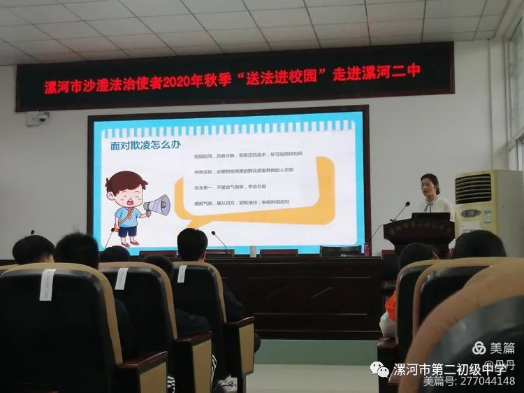 为增强青少年法治意识,保护青少年合法权益,加强学校法治教育,9月22日下午我校开展漯河市沙澧法治使者2020年秋季“送法进校园”活动。
