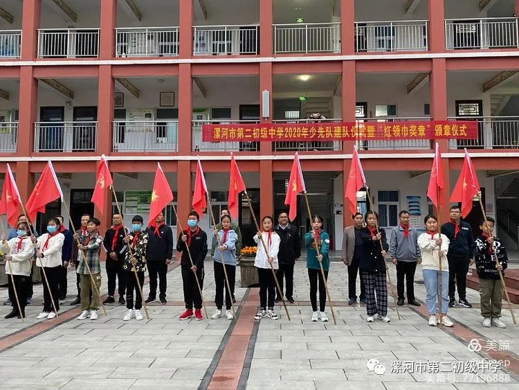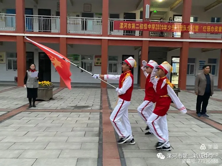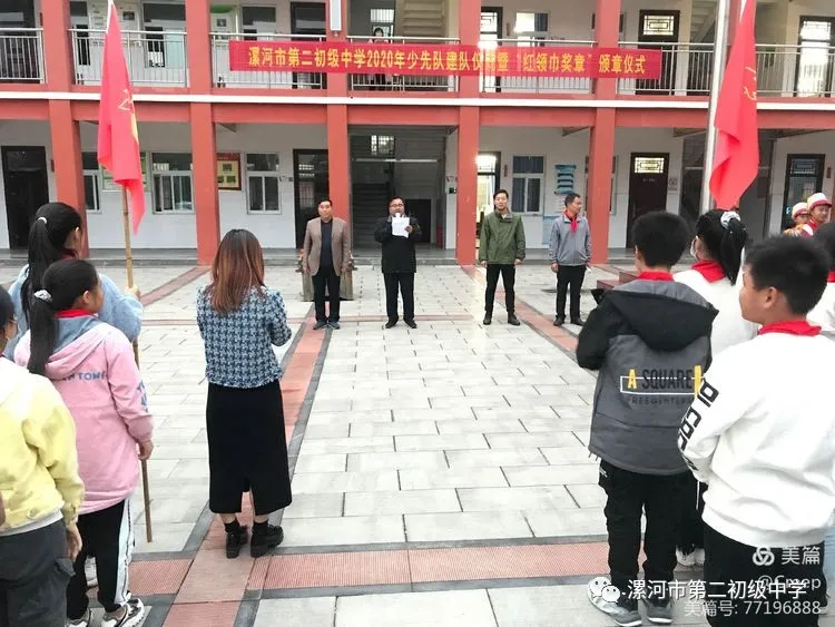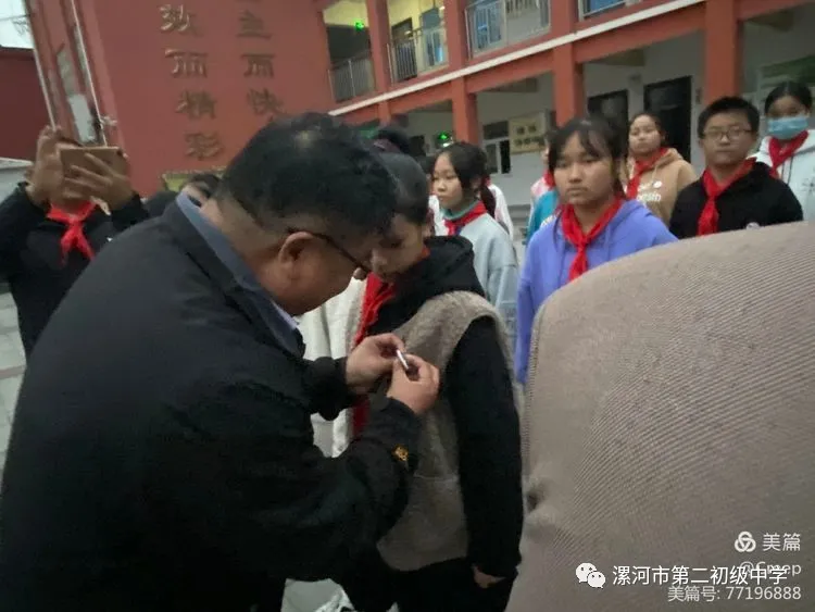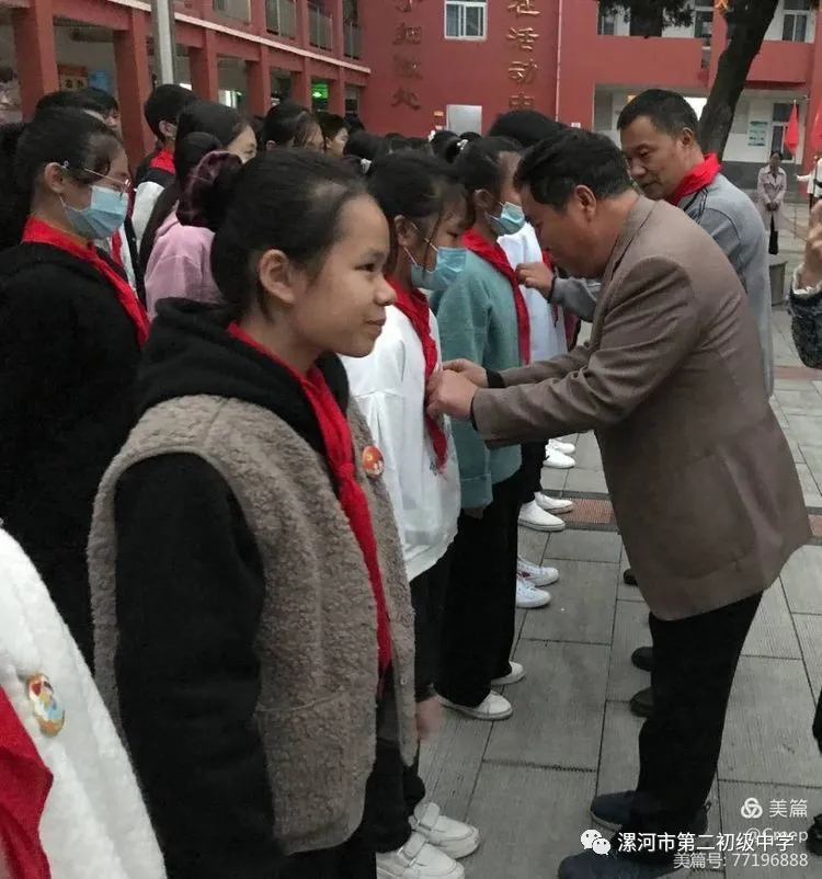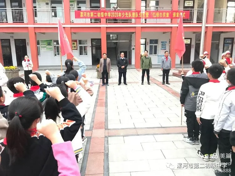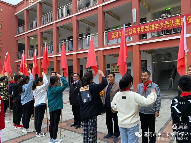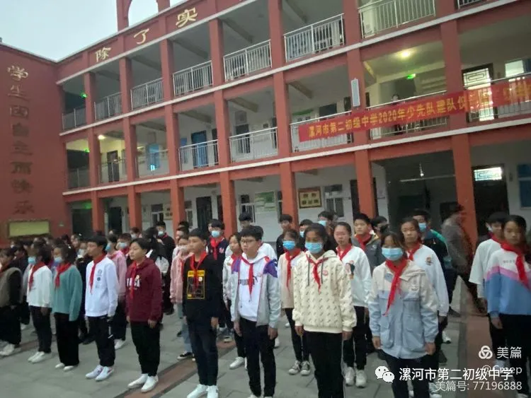 接着,全体师生高唱《中国少年先锋队队歌》。漯河市第二初级中学党总支副书记张运亭宣布组建七年级少先队组织的决定。经学校研究决定,七年级成立十二个中队,分别聘请杨伟亮等十二名老师担任新中队的辅导员。