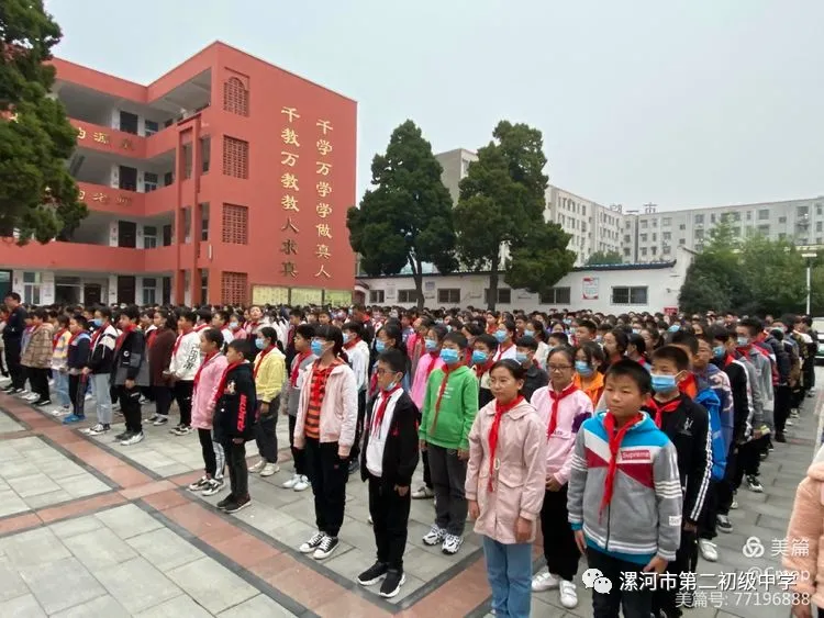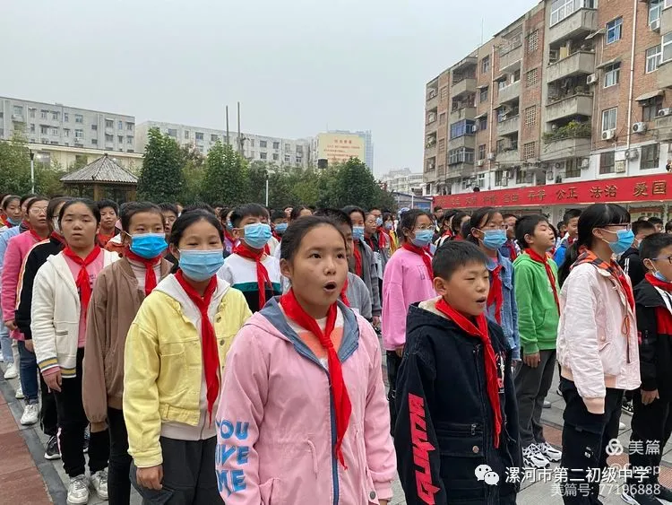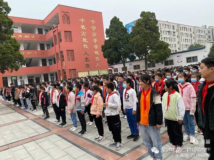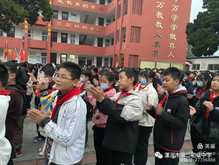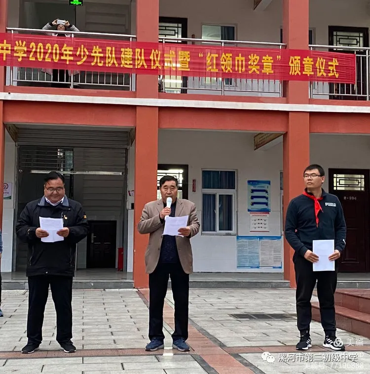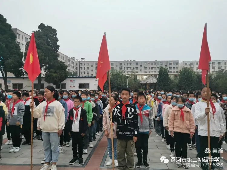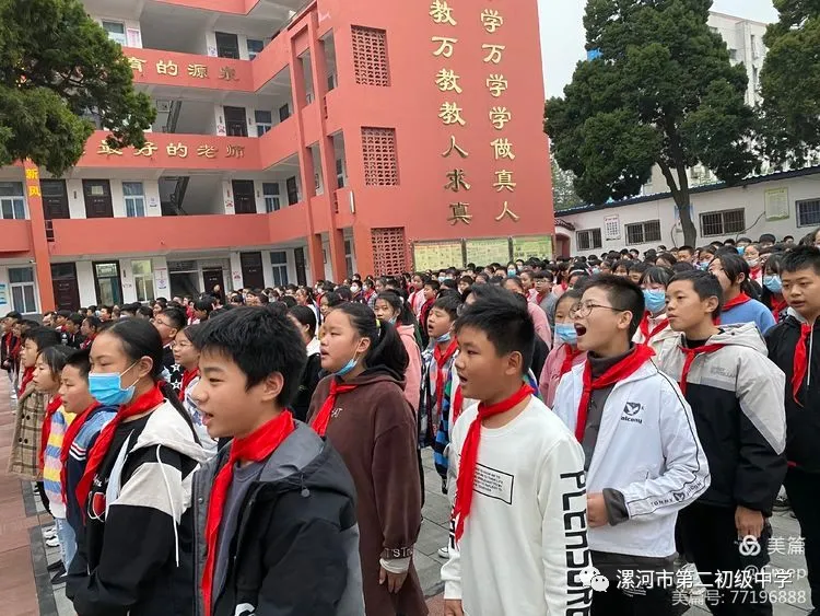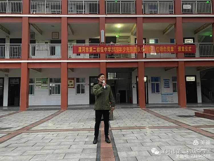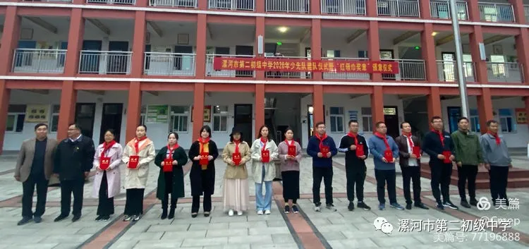 接着,全体师生高唱《中国少年先锋队队歌》。漯河市第二初级中学党总支副书记张运亭宣布组建七年级少先队组织的决定。经学校研究决定,七年级成立十二个中队,分别聘请杨伟亮等十二名老师担任新中队的辅导员。