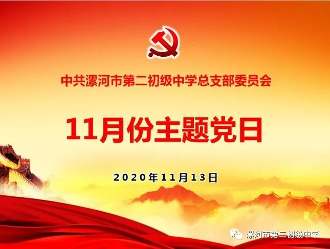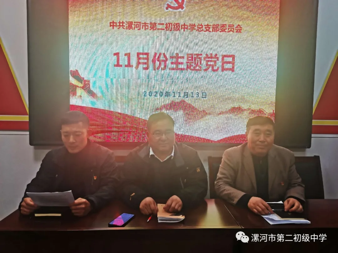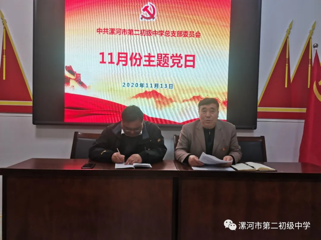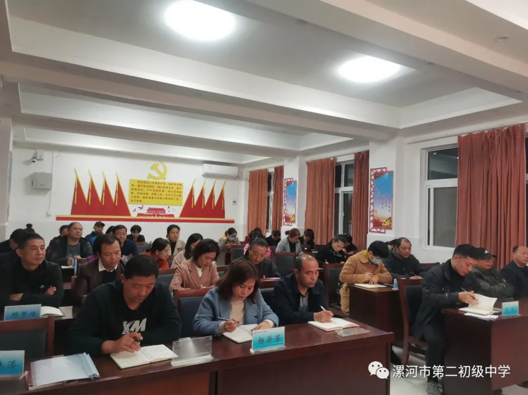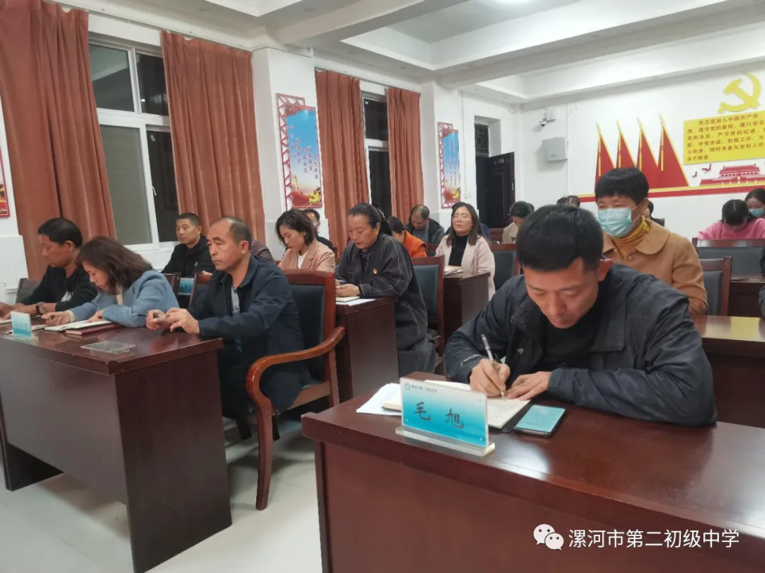 为更好地学习贯彻党的十九届五中全会精神,深刻领会习近平总书记在纪念中国人民志愿军抗美援朝出国作战70周年大会上的讲话精神,11月13日下午,中共漯河市第二初级中学总支部委员会在西校区党员活动室召开全体党员会,开展11月份“主题党日”活动。活动由党总支书记马开收主持,全体党员、发展对象、入党积极分子参加。