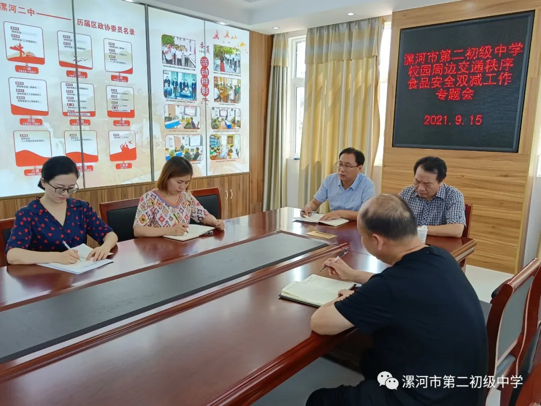 全市校园周边交通秩序、食品安全和“双减”工作推进会后,漯河二中高度重视会议精神的传达和落实,9月15日上午,漯河二中召开专题会,对我校周边环境、交通拥堵治理、学生用餐和“双减”工作进行强化部署。
